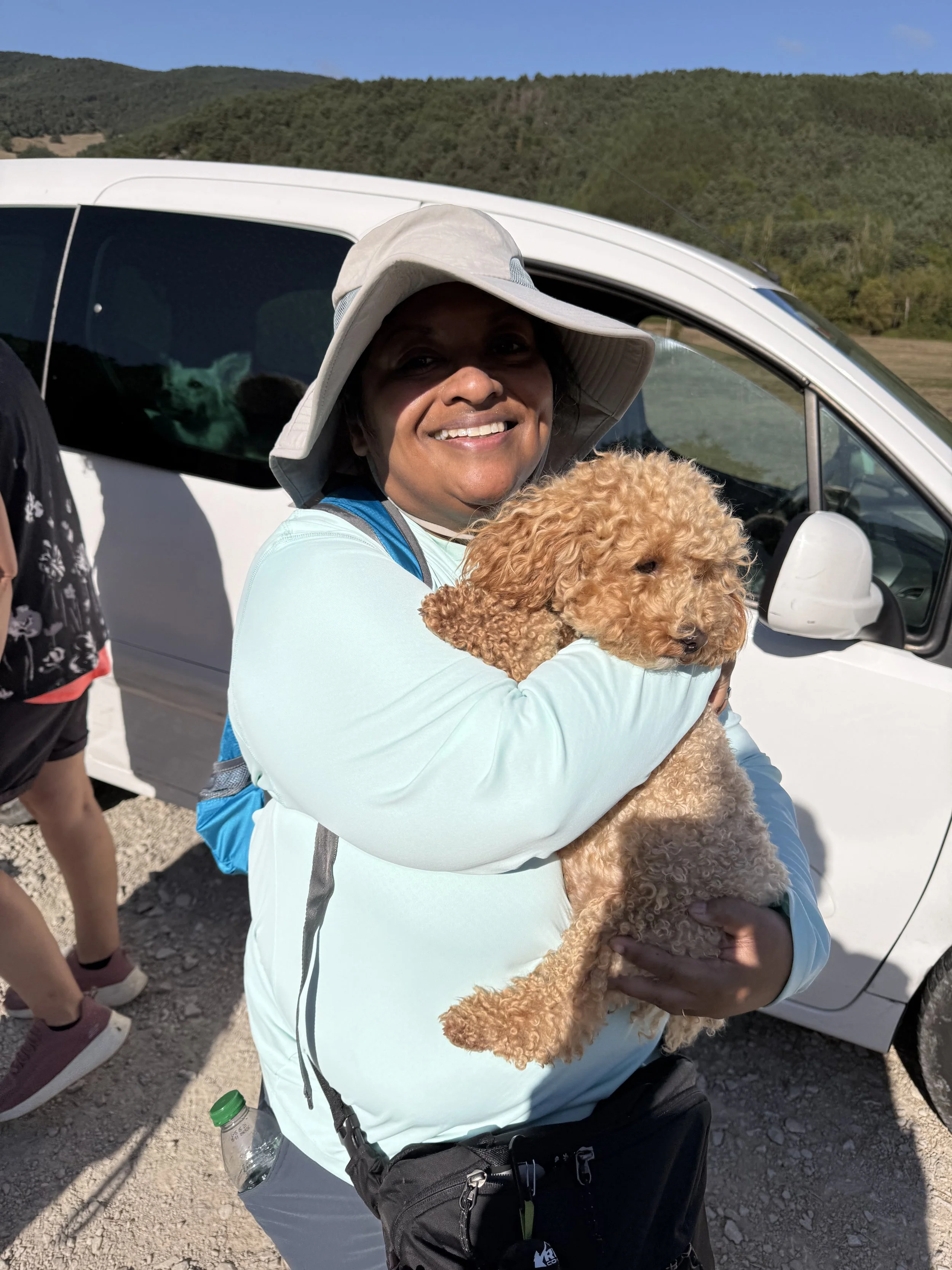 Here’s a little lesson - when a European tells you it is an easy flat walk they are lying! Ok maybe not lying but their definition of flat is not the same as our Midwest definition of flat. The walk from Zubiri to Pamplona is about 13 miles and has an elevation gain of 1496 feet and loss of 1771 feet. Lots of rolling hills but over all a nice walk. According to all the Camino apps there are 5 towns along the way so we figured we would head out and stop for breakfast at the first town. Would have been a great idea if anything in the town was open! So we trekked on and I was getting crankier because I didn’t have my morning coffee. We get to the next town, which was smaller than the last and same thing…not a soul in sight. We continued on and the path went into a pretty forest and I was starting to panic bc I was feeling exhausted and like I wouldn’t be able to make it much longer. As we walked up a hill we saw a white van had just parked and there was a small white poodle in the front. This, of course, made me want to walk faster to see if I could say hi and then the most amazing thing happened. The woman who drove the van, opened the van door and SIX dogs came spilling out. I thought I was hallucinating! Then the nice woman handed me this little peanut who leapt into my arms